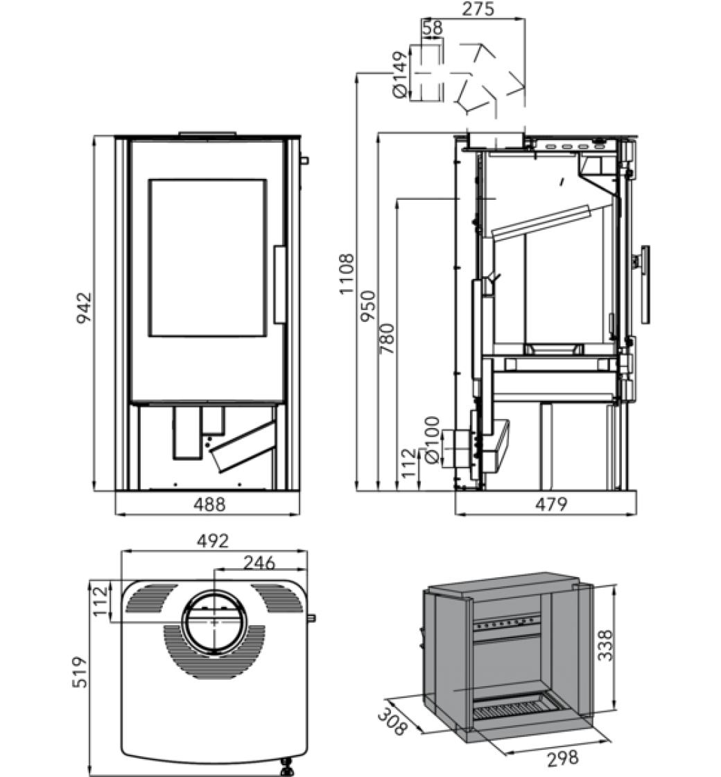 Kamna jsou svařena z ocelových plechů o tloušťce 2-5 mm. V prostřední části kamen je spalovací komora uzavíratelná pomocí přikládacích dvířek, která jsou u některých typů opatřena samozavíracím mechanismem. Dvířka jsou osazena speciálním velkoplošným sklem, které je schopno odolávat teplotám až 800 C. Vnitřní prostor spalovací (plnící) komory je vyložen tepelně a pevnostně odolnými tvarovkami.