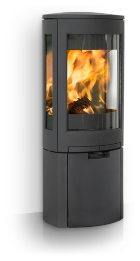 Jøtul F 378 Advance stojí na podstavci s litinovými dvířky. Moderní, čisté linie od shora až dolů.