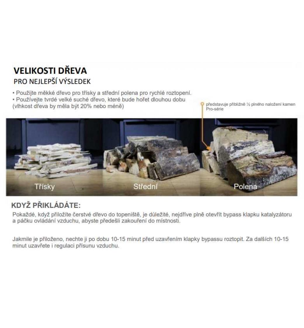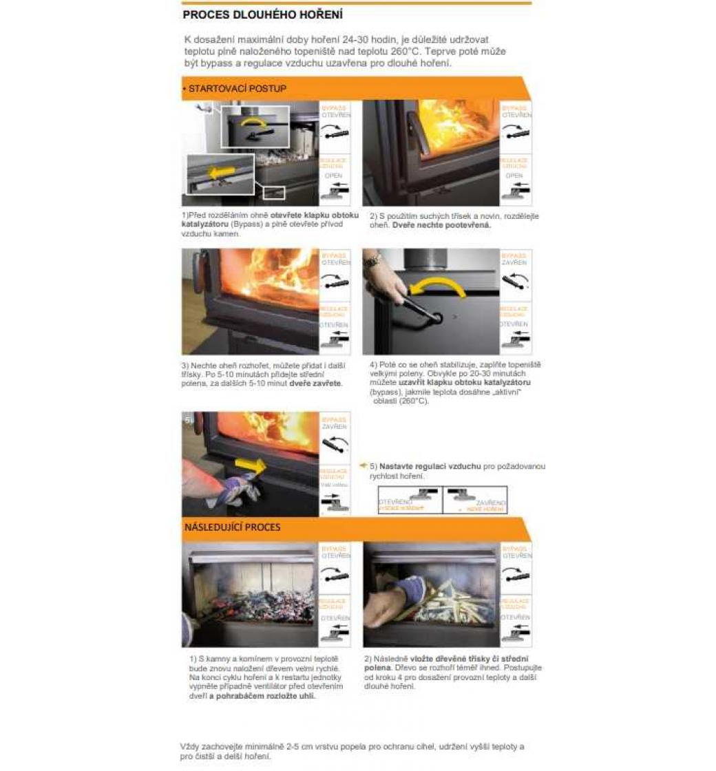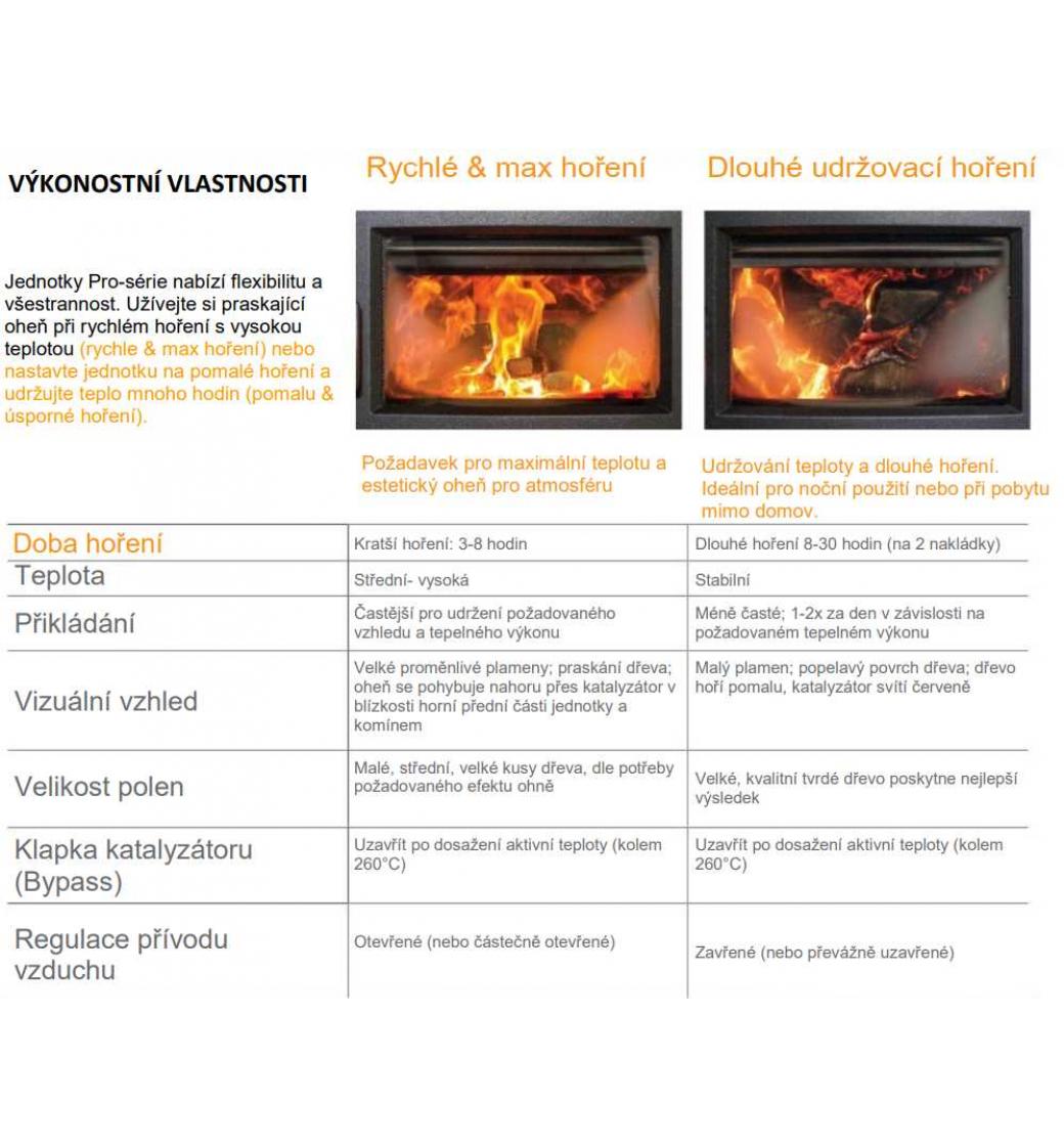 Doba přikládání (hoření) - 24 hodin - díky hybridnímu systému katalytického spalování. Výkon 6-20 kW. Max délka polen 50 cm.