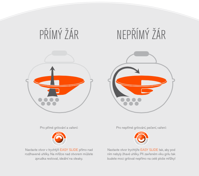 Pro nepřímé grilování, pečení, vaření…Nastavte otvor trychtýře EASY SLIDE tak, aby pod ním nebyly žhavé uhlíky. Při zavřeném víku grilu tak budete moci grilovat nepřímo na celé ploše mřížky!