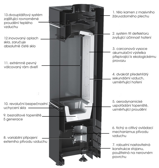 Propracovaný systém rozvodu vzduchu zaručuje křišťálově čisté sklo i za zhoršených podmínek a inovativní přístup k distribuci sekundárního vzduchu přispívá k neopakovatelnému vizuálnímu zážitku při pohledu na vysoký formát ohně. Stejnou měrou, jakou jsou tato kamna inovativní na poli techniky, jsou nezaměnitelná svým charakteristickým designem a pojetím vyobrazení ohně. Při vývoji těchto kamen byl brán značný zřetel na kvalitu hoření jak z pohledu vysokých účinností, tak z pohledu na finální vizuální dojem hořícího ohně. Topeniště je vybaveno moderním akumulačním materiálem Carconem, který je v základu v bíle barvě, nicméně na přání zákazníka je možné jej dodat i v černé nebo červené. Aries 3E jsou vysoce elegantní kamna malých rozměrů, jejichž rohové prosklení dokáže zvednout celkový dojem z každého interiéru.