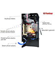 U kamen řady Flamingo je systém spalování na nejvyšší úrovni a zajišťuje centrální přísun vzduchu z exteriéru, který zajišťuje bezpečnost před výbuchem plynných částí pomocí plynulého přisávání čerstvého vzduchu. Inovativní prvek zajišťuje vysokou účinnost, snížení spotřeby paliva až o 40 % a zejména šetrnost k životnímu prostředí. Množství popela je minimální. Celý spalovací proces je ovládán dvěma táhly, kdy první slouží k regulaci primárního vzduchu, který je zapotřebí k zatopení a rozhoření dřeva. Druhé táhlo slouží k podpoře sekundárního spalování. Jeho otevřením dochází k přísunu předehřátého vzduchu do horní části spalovací komory. Tento vzduch se používá k úspornému a co nejefektivnějšímu průběhu hoření dřeva. Tímto je zajištěna vysoká účinnost a krásné hoření včetně čistého skla.
