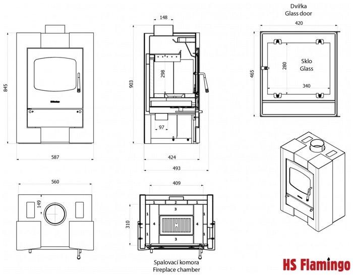 Komora je konstruovaná tak, aby byla dosažena vysoká účinnost a malá spotřeba paliva, která činí průměrně 2,5 kg na hodinu. Spalovací komora je vyrobená ze silného ocelového plechu a pro dokonalejší spalování je vysázena pravým šamotem. Sekundární spalování, krásně čisté sklo a externí přívod vzduchu je u kamen Flamingo samozřejmostí. Kamna jsou vyrobená z kvalitních materiálů a díky tomu Vám můžeme poskytnout záruku 5 let.
