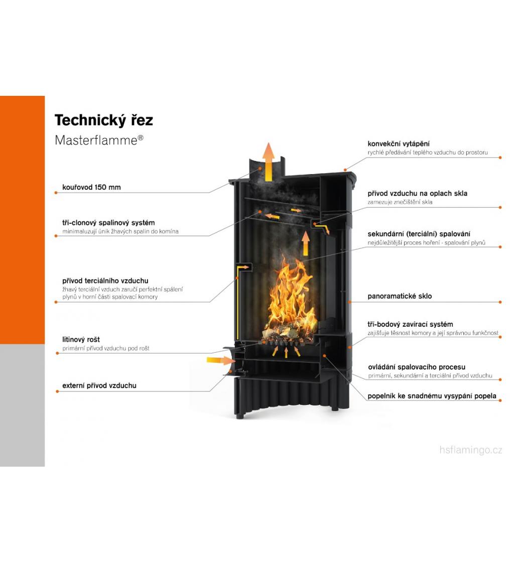 Krbová kamna Masterflamme díky své masivní konstrukci zastupují vysoce kvalitní segment trhu. Trubkové řešení spalovací komory zajišťuje velmi nízkou roztažnost materiálu, vysokou kvalitu a dlouhou životnost celého zařízení. Trubky zaručují maximální předání tepla a velmi rychlé ohřátí vzduchu proudícího v trubkách. Tento princip vytápění zajišťuje rovnoměrné rozdělení teplého vzduchu nejen po místnosti, kde stojí kamna, ale také do dalších místností.