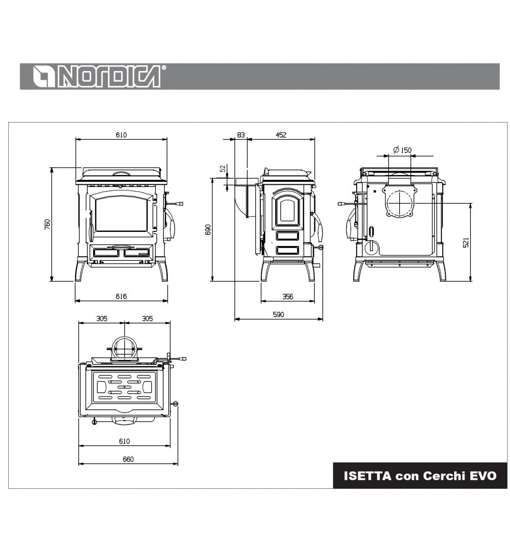 Jedná se o kamna,  která jsou ideální pro vytápění středních až velkých prostor. Charakteristickým rysem je jejich velké sklo, které umožňuje sledovat plápolající oheň a tím dodává místnosti útulnou atmosféru. Kamna Nordica Isetta con Cerchi Evo 4.0 jsou vybavena inovativním systémem pro čisté spalování, což zajišťuje efektivní využití paliva a minimalizaci zbytkového popela. Navíc, díky svému elegantnímu černému provedení, kamna snadno zapadnou do různých designových stylů interiéru, od tradičních po moderní. Tento model tak představuje ideální spojení funkčnosti, efektivity a estetické hodnoty, které splní očekávání i těch nejnáročnějších uživatelů hledajících kvalitní a spolehlivý zdroj vytápění.