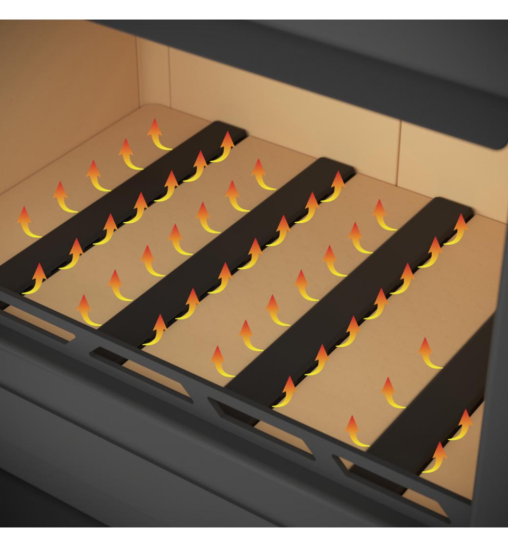 Revoluční řešení spalovací komory nabízí nepřekonatelný zážitek z ohně. Dřevo hoří po celé ploše dna, díky systému bezroštového spalování a systému kanálků na přívod vzduchu. Výsledkem je minimální spotřeba paliva. Pohled do ohně jsme povýšili na novou úroveň.