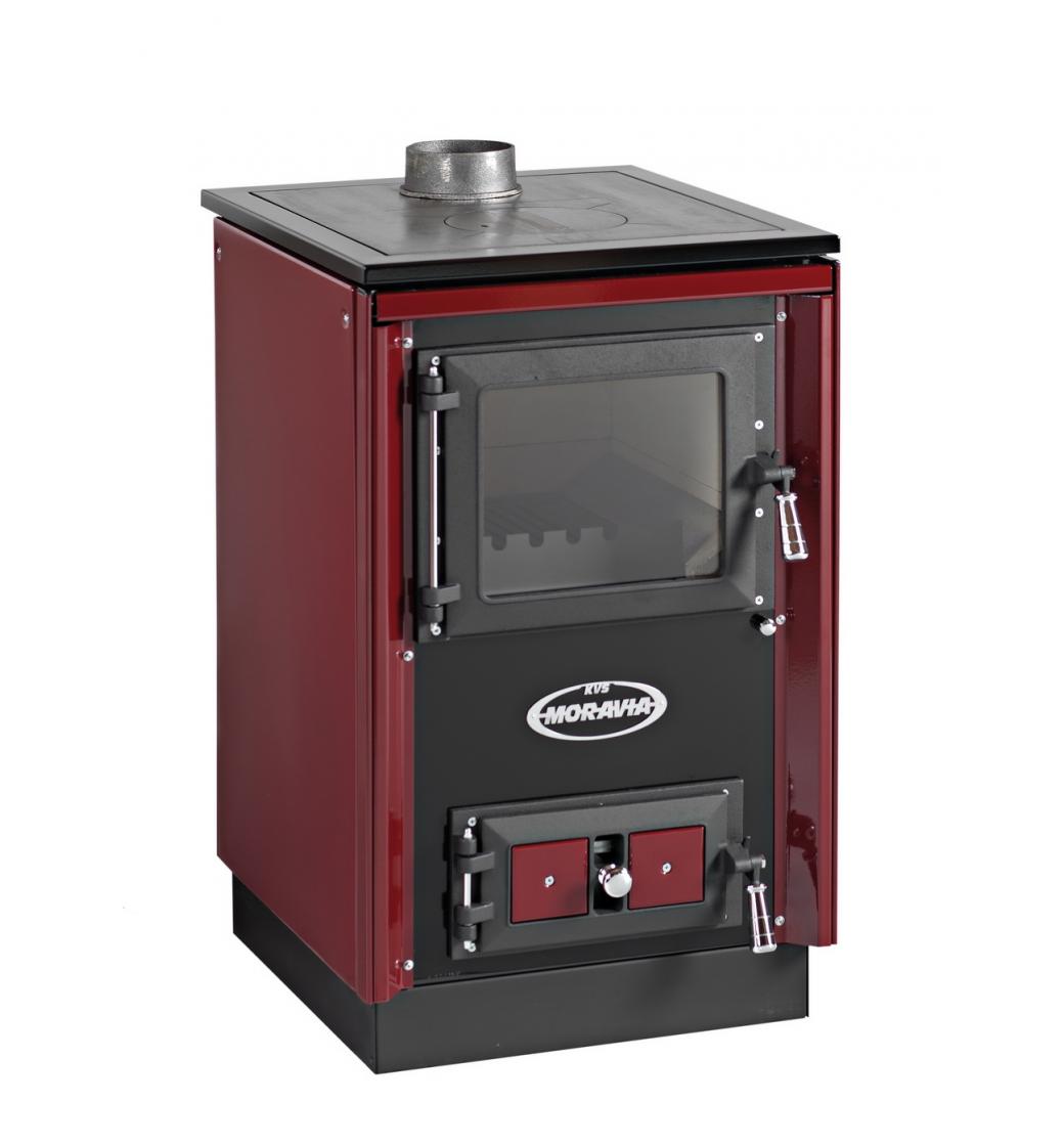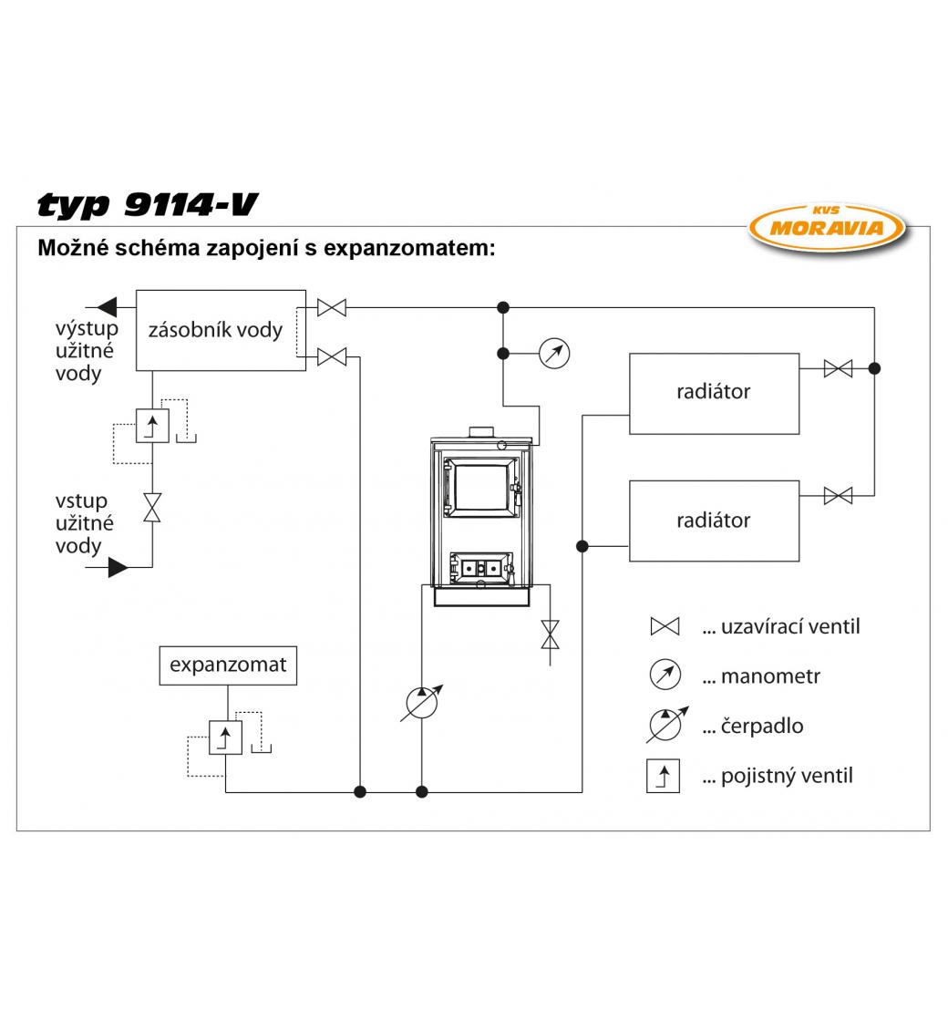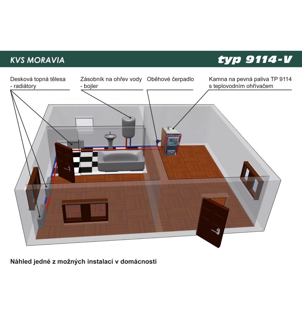 Tento typ s teplovodním ohřívačem (výměníkem) propojuje výhody spotřebiče určeného k vaření, ohřívání pokrmů, a kotle na ústřední vytápění. Typ 9114-V také okouzluje tím, že je možné vidět i plápolající oheň přes prosklená dvířka topeniště. Materiály použité při výrobě tohoto typu jsou podobné ve srovnání s ostatními typy spotřebičů KVS MORAVIA.