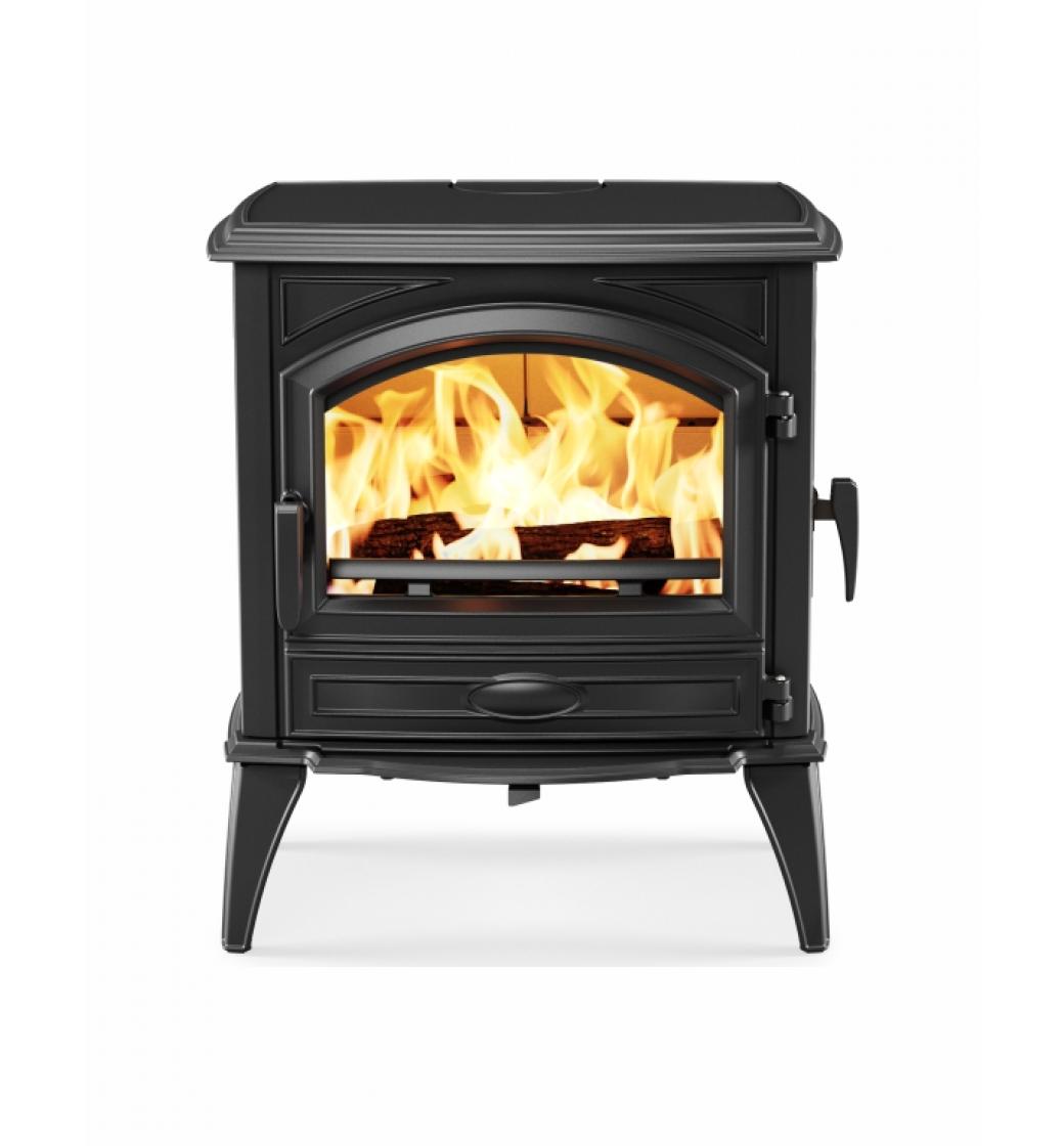 Celolitinová krbová kamna na dřevo, dřevěné brikety. Velké prosklení předních přikládacích dvířek, boční přikládací dvířka.