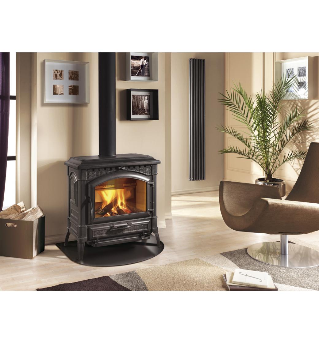 Litinová krbová kamna s teplovodním výměníkem Nordica Termoisotta D.S.A. mají jmenovitý výkon 6.5 kW do místnosti a 8.5 kW do výměníku, účinnost 78,4 %.