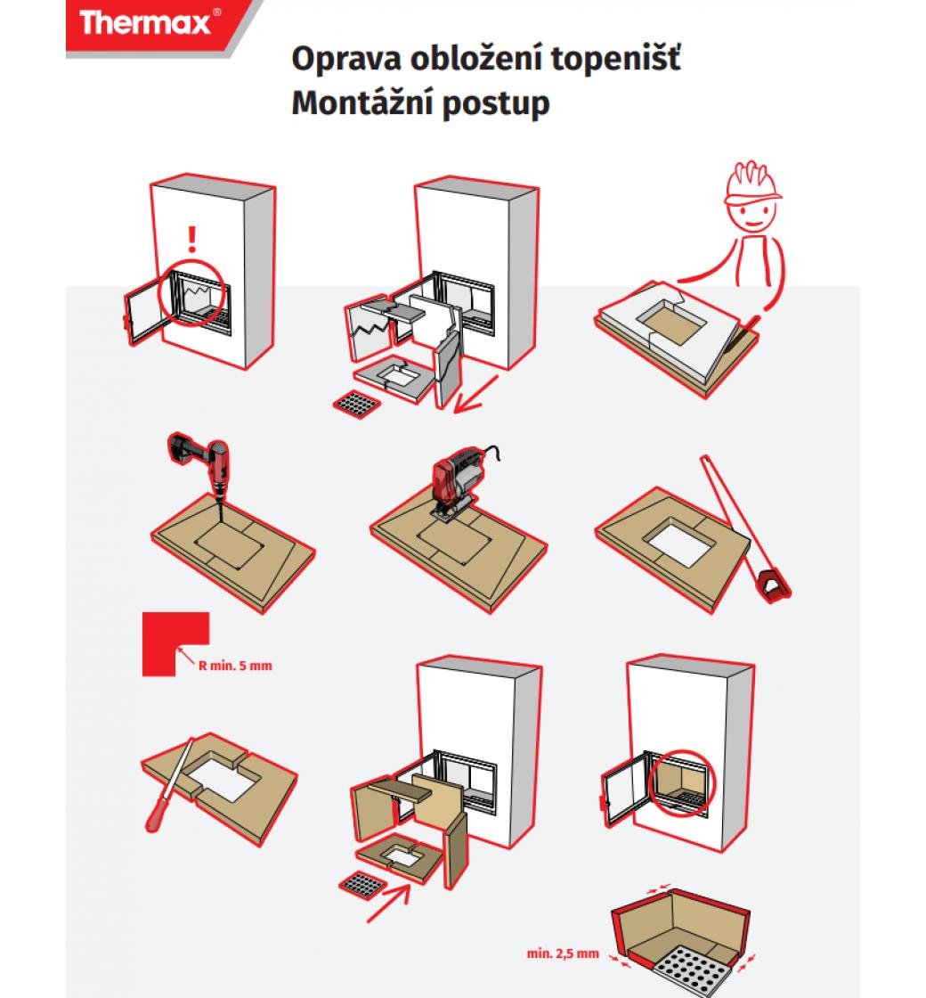 Konkrétní instalace potřebuje konkrétní řešení. Pokud desky instalujete jako vyzdívku topeniště, pamatujte na roztažnost a vynechejte mezi deskami vůli dle velikosti desek a topeniště 3 mm a více. Zabráníte tak prasknutí desky.