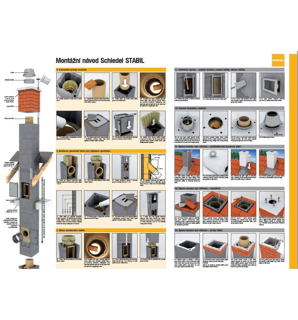 komínové tvárnice, komínové vložky, izolační rohože, komínová vložka pro kouřovod 90°, komínová vložka pro dvířka, základní souprava, krycí deska, sklobetonová pro zateplení (přesah 8 cm), kónické vyústění, maltová směs, maltovací šablona
