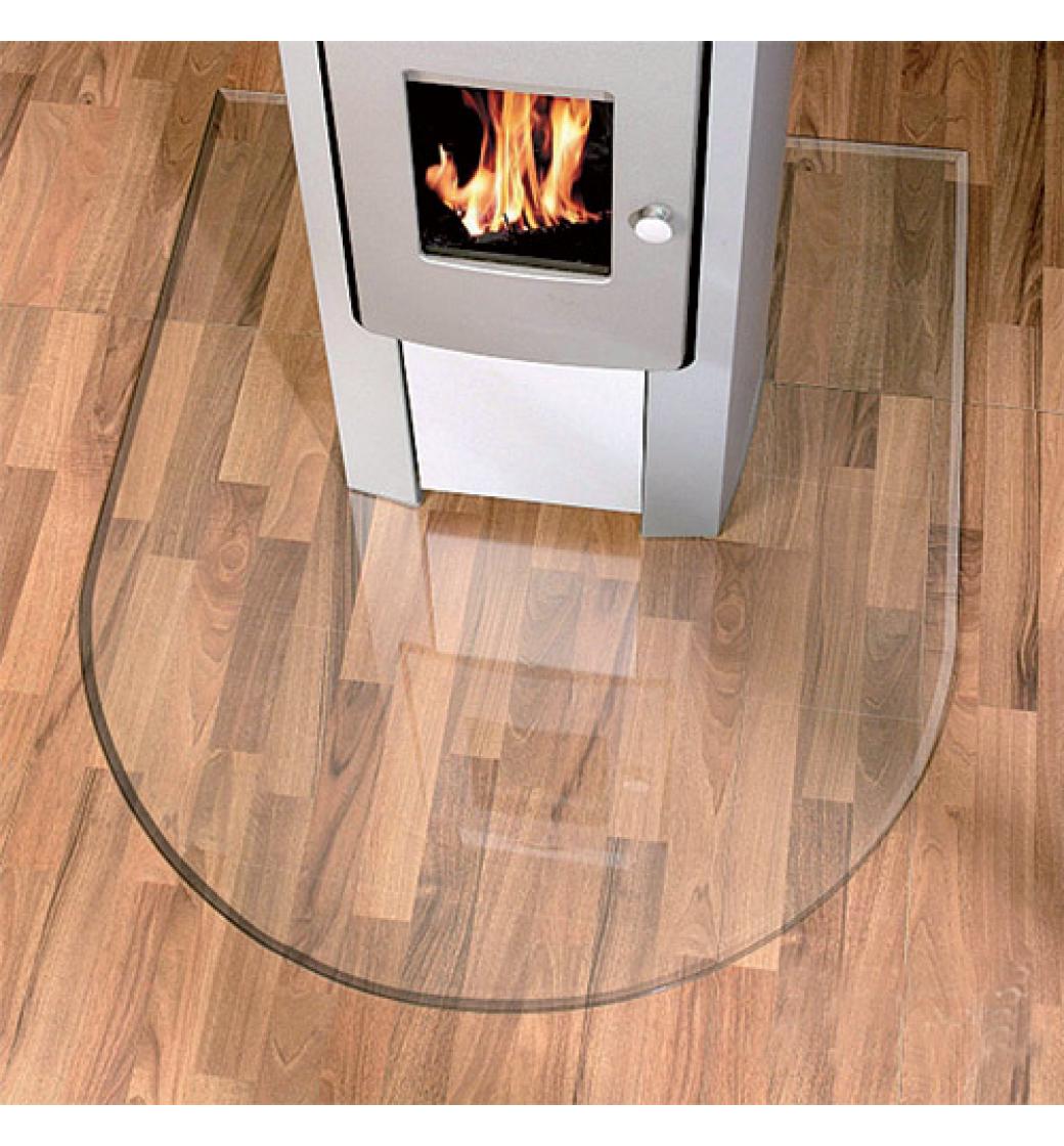 Sklo pod kamna,tvrzené čiré,odolné vůči vysokým zátěžím. Broušená fazeta na nášlapných hranách eliminuje možnost zakopnutí o hranu.