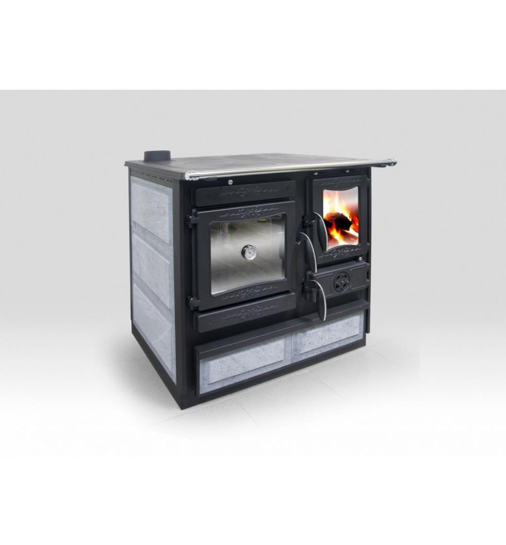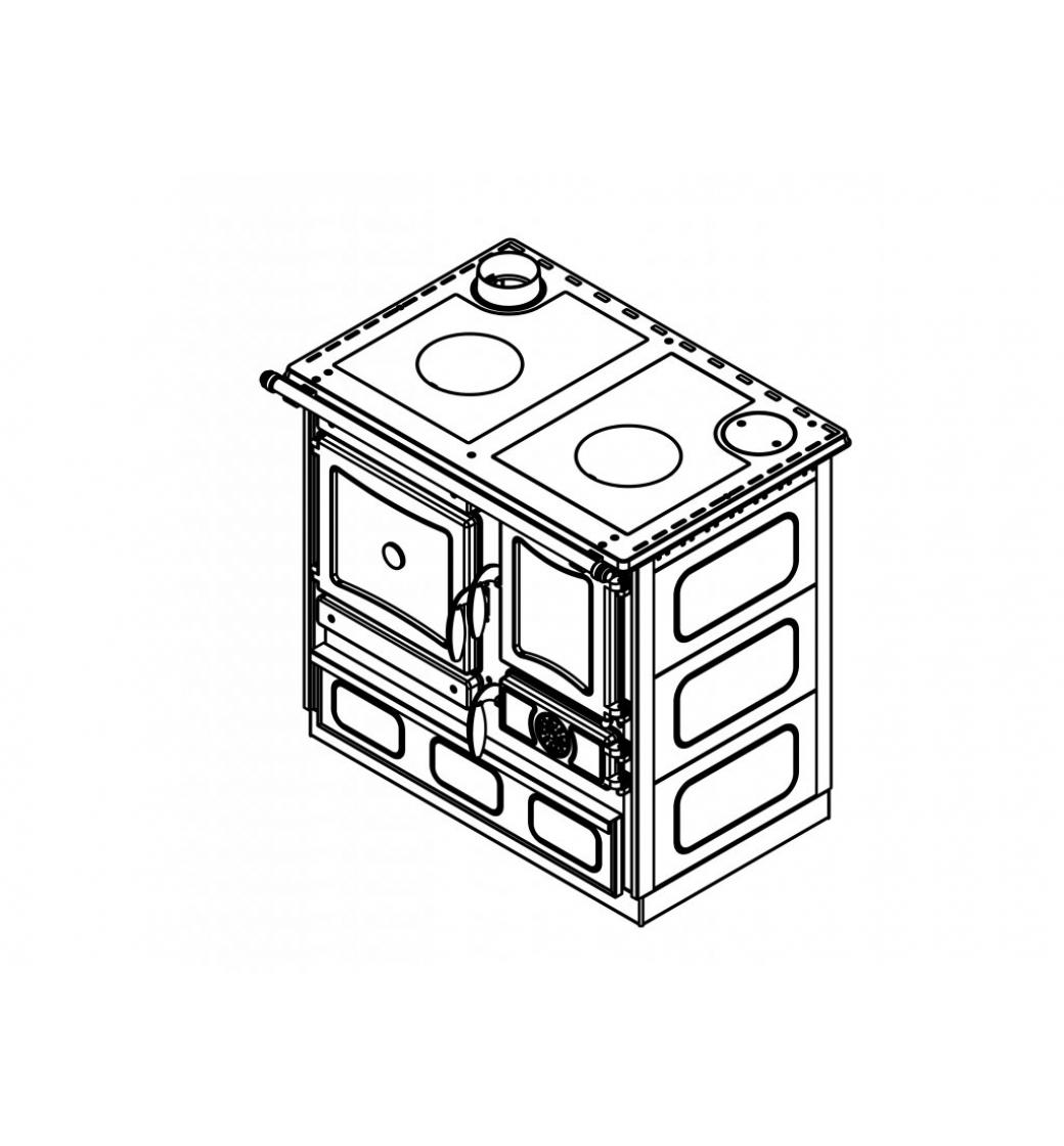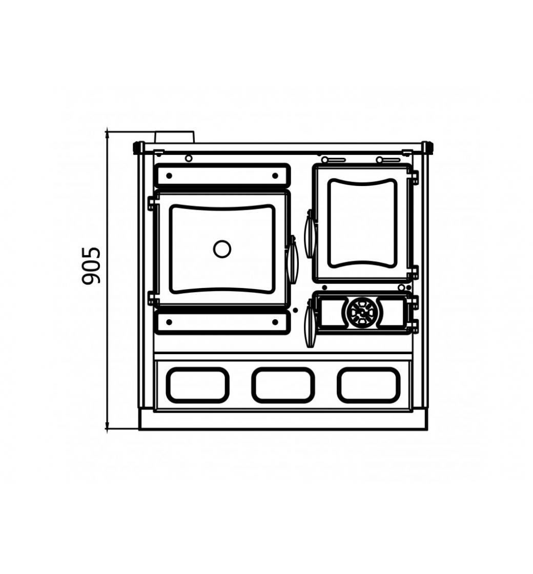 Dvířka disponují teploměrem. Prostor topeniště je vybaven dvěma rošty pro letní a zimní provoz. Pod celým sporákem se nachází praktická zásuvka, například na uskladnění paliva.