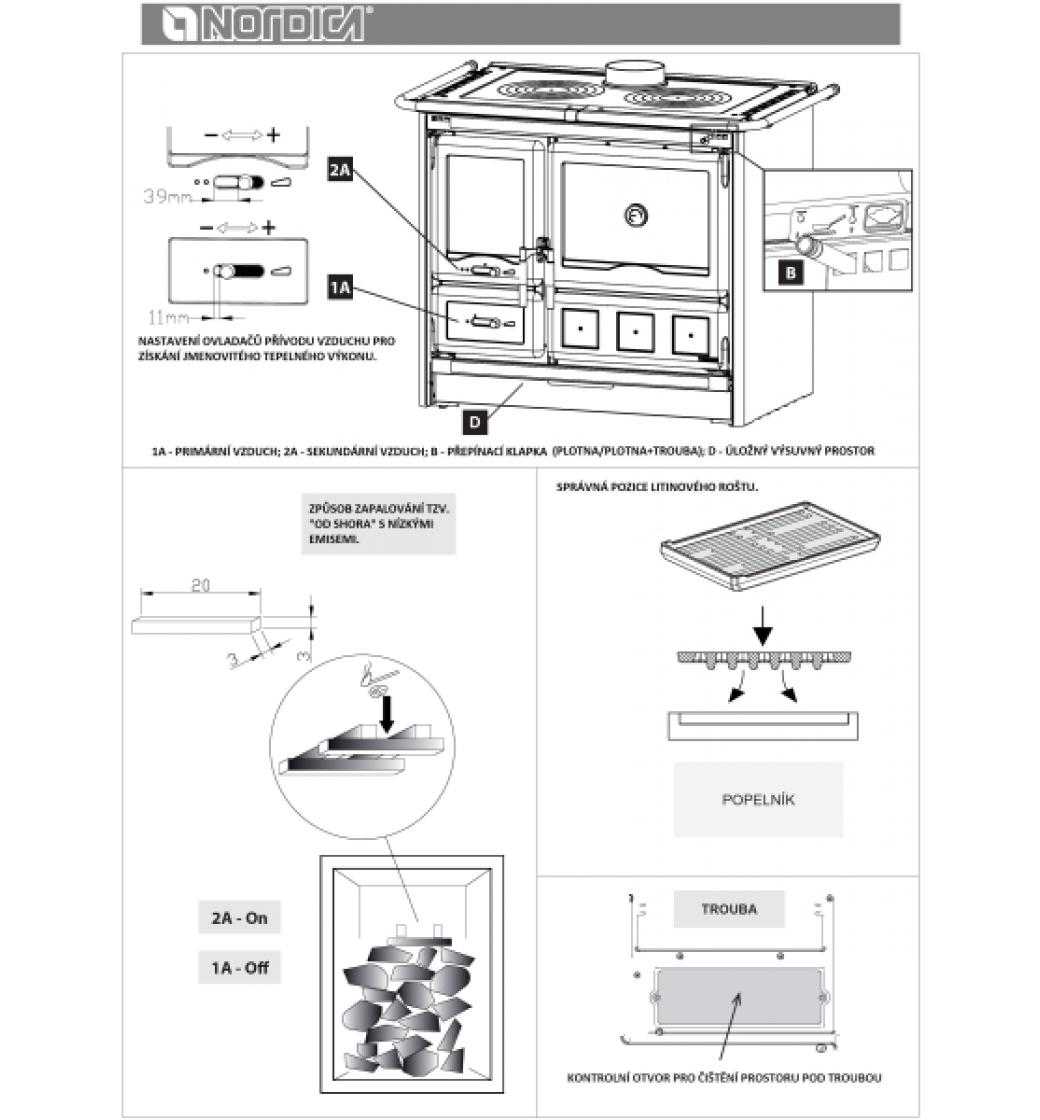 Dvířka od topeniště mají dvojité prosklení, které omezuje nežádoucí sálavé teplo při vaření, kdy uživatel musí stát v jeho blízkosti a zároveň je mezi skly prudce předehříván vstupující sekundární vzduch pro dokonalé spalování. Kličky dvířek sporáku jsou izolované pro pohodlnou obsluhu za provozu. Spalování je třístupňové s velmi vysokou účinností přesahující fantastickou hodnotu 86,7 %. Topeniště je litinové a na jeho bocích jsou šamotové desky pro lepší akumulaci tepla a lepší průběh spalování. Pod roštem topeniště je snadno odnímatelný popelník.