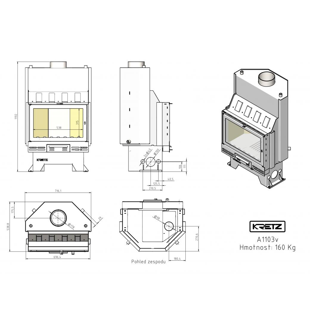 Krbová jednoplášťová vložka Kretz A 1103 V, teplovodní - topeniště šamot.