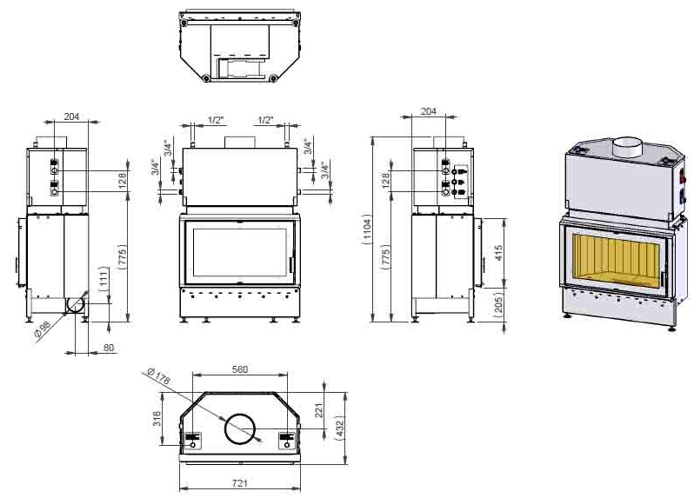 Teplovodní krbová vložka s topeništěm z litého žárobetonu, rovným prosklením a teplovodním výměníkem s vychlazovací smyčkou.Teplovodní krbová vložka Kretz B103 - V10