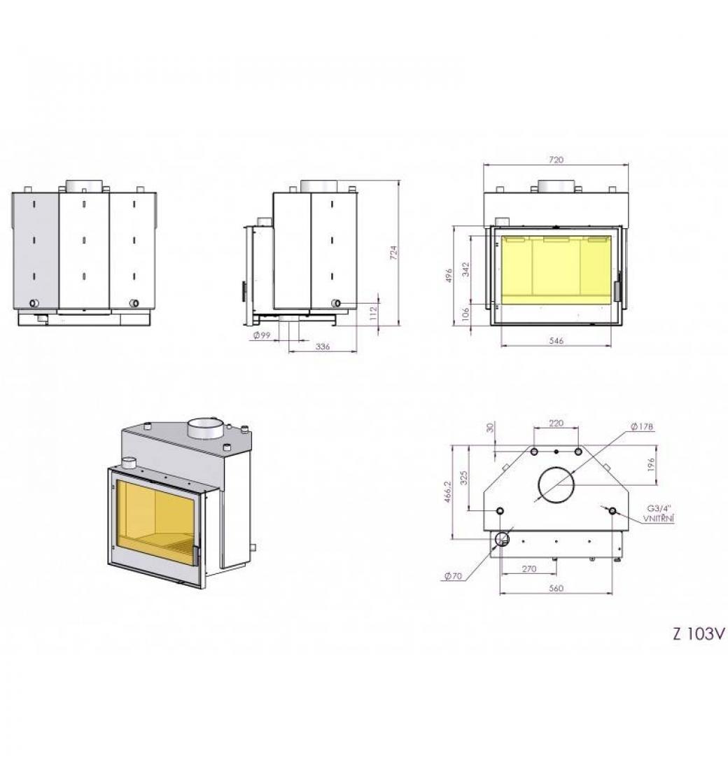 Teplovodní ocelová vložka KRETZ Z 103 V s rovným sklem a šamotovým topeništěm.