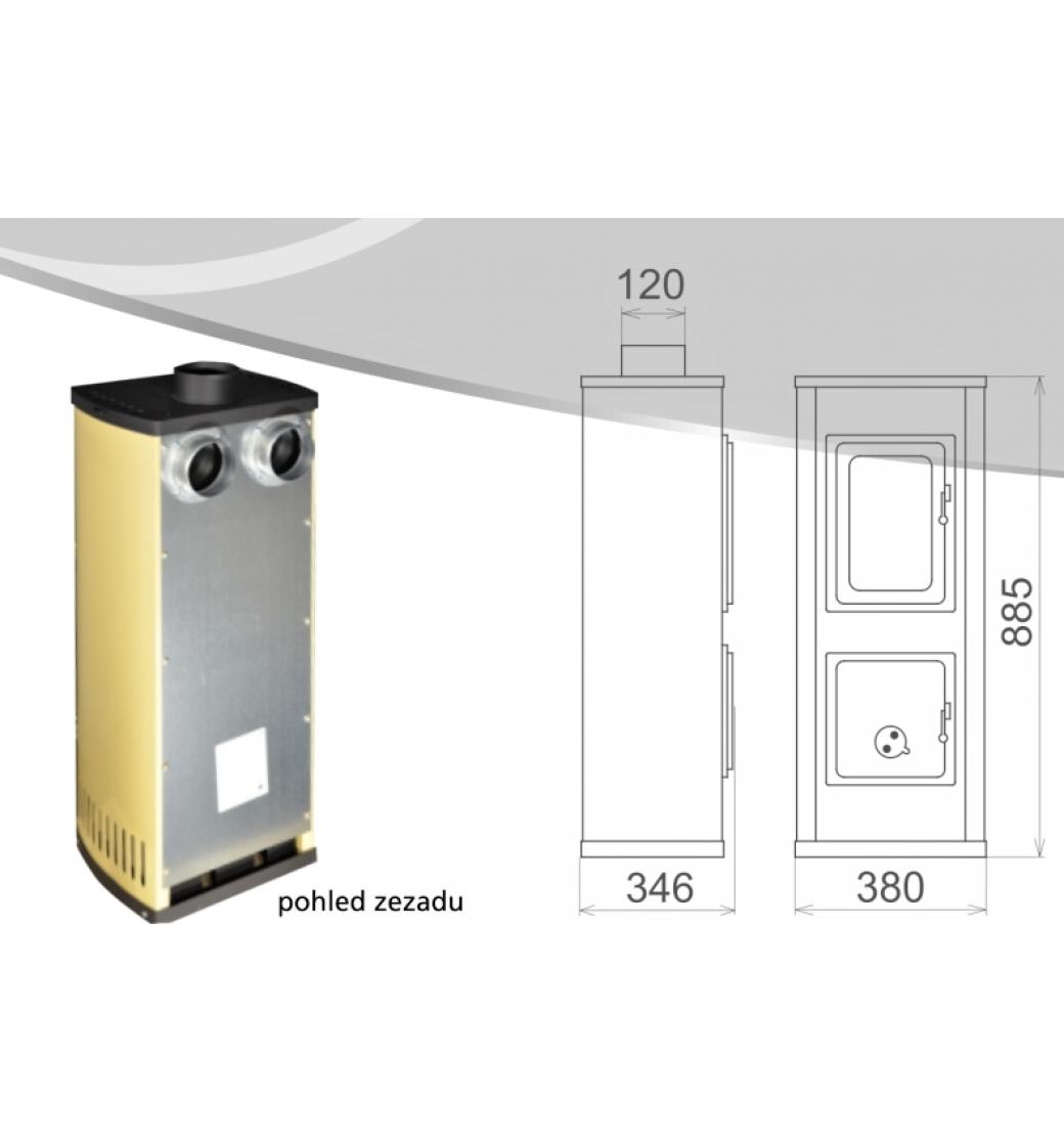 Zadní stěna druhého pláště umožňuje napojení na rozvod teplého vzduchu pro vytápění dalších místností.